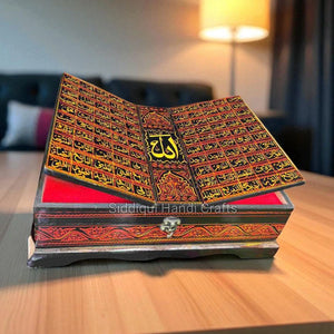 Quran Box is a beautifully designed storage case or decorative container used to keep a copy of the Holy Quran safely. These boxes come in various materials, such as wood, metal, leather, or acrylic, and often feature intricate Islamic calligraphy, geometric patterns, or floral designs. Some Quran boxes are handcrafted with mother-of-pearl inlays, gold or silver plating, or velvet lining inside to protect the sacred book.