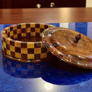 - A wooden hotpot made in Sheesham wood with brass inlay engravings on the sides and lid top.