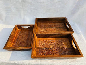 A large-sized tray set of 3 made from solid Sheesham wood with intricate hand-carving in a matte finish. The natural wood grain adds a beautiful texture to the tray, enhancing its aesthetic appeal. The smooth and vibrant bottom makes it visually pleasing and practical for serving purposes. It’s well-suited for various occasions and is particularly ideal for serving high tea. The combination of the solid Sheesham wood, hand-carving details, and matte finish not only makes it a functional serving tray but also a decorative item that can add a touch of elegance to your tea sessions or any other gatherings.